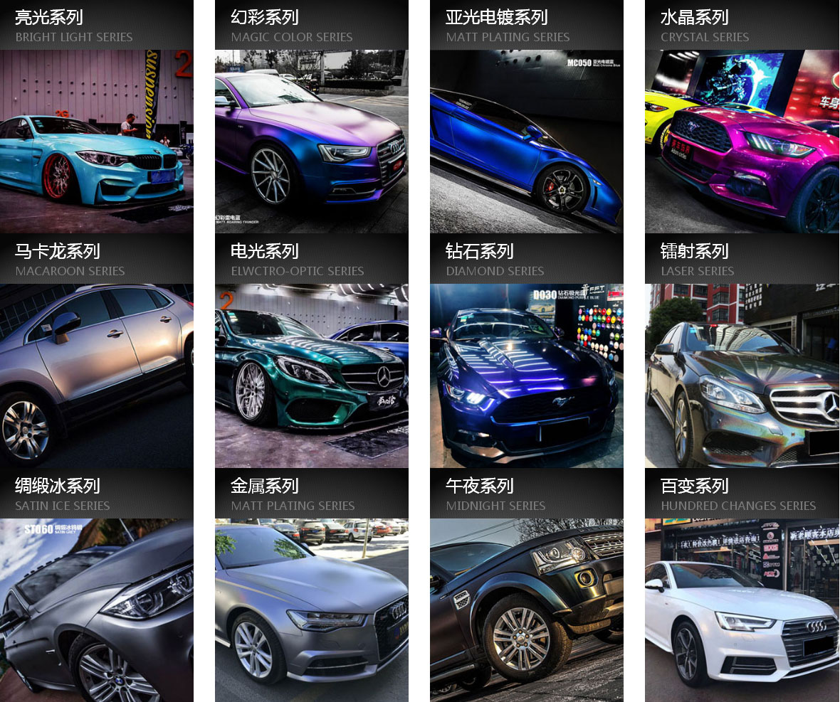 酷佳迪高性能车身贴膜品牌 打造最具性价比的改色车身贴膜产品。拥有电光系列,水晶系列,超亮金属系列等十几个系列,200多个颜色,颜色众多,色彩饱满鲜明,满足车主对爱车个性需求。